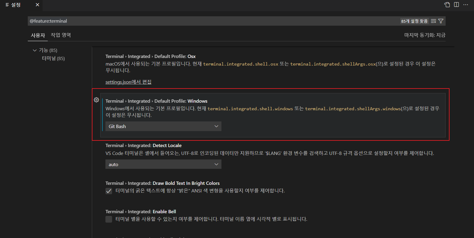 terminal.integrated.defaultprofile.windows 에서 Git Bash 선택
